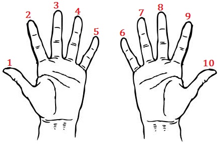 1º passo: Atribuímos números de 1 a 10 aos dedos conforme a figura abaixo.